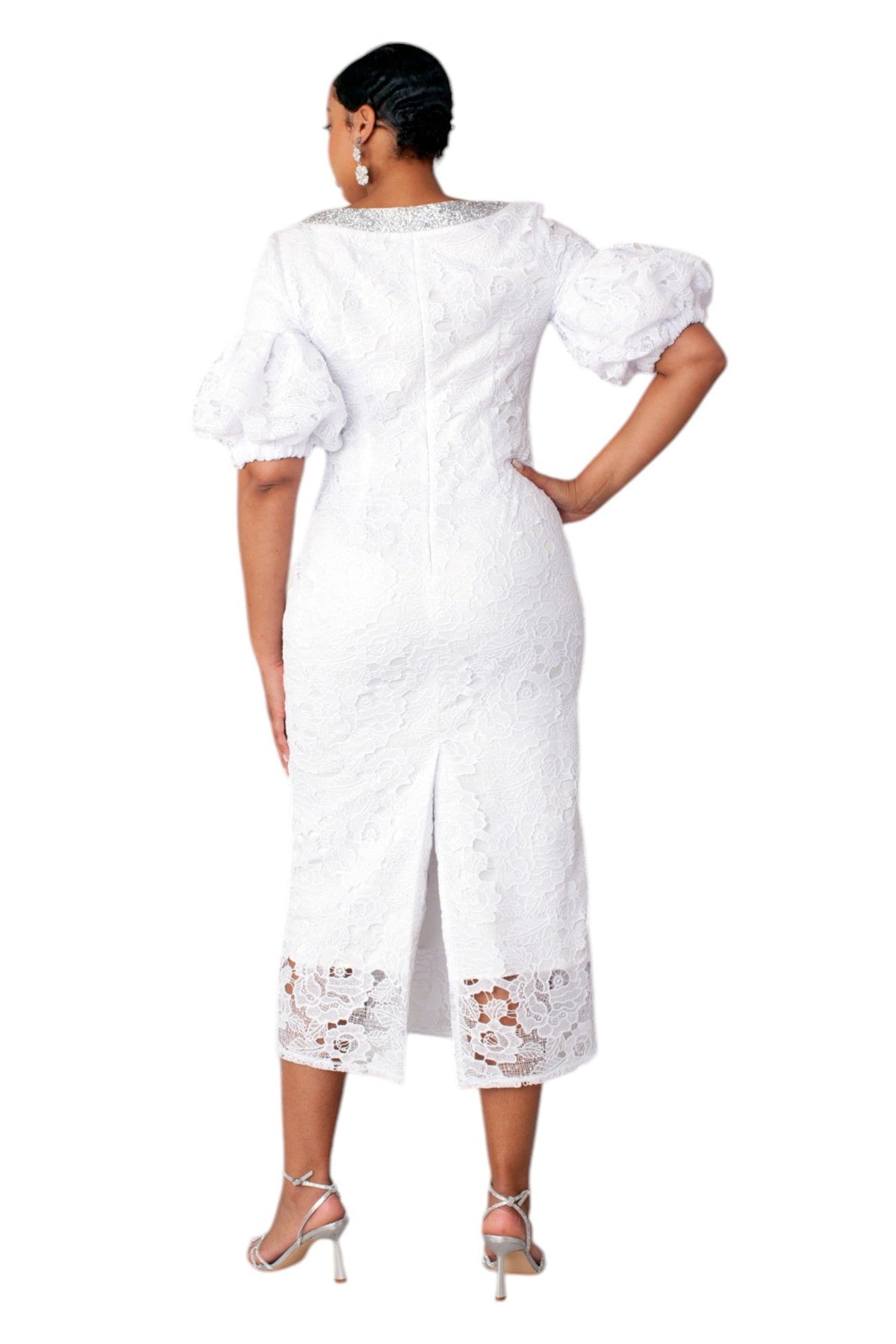 Lacy Dress with Puff Sleeves and Sparkling Neckline- 4888