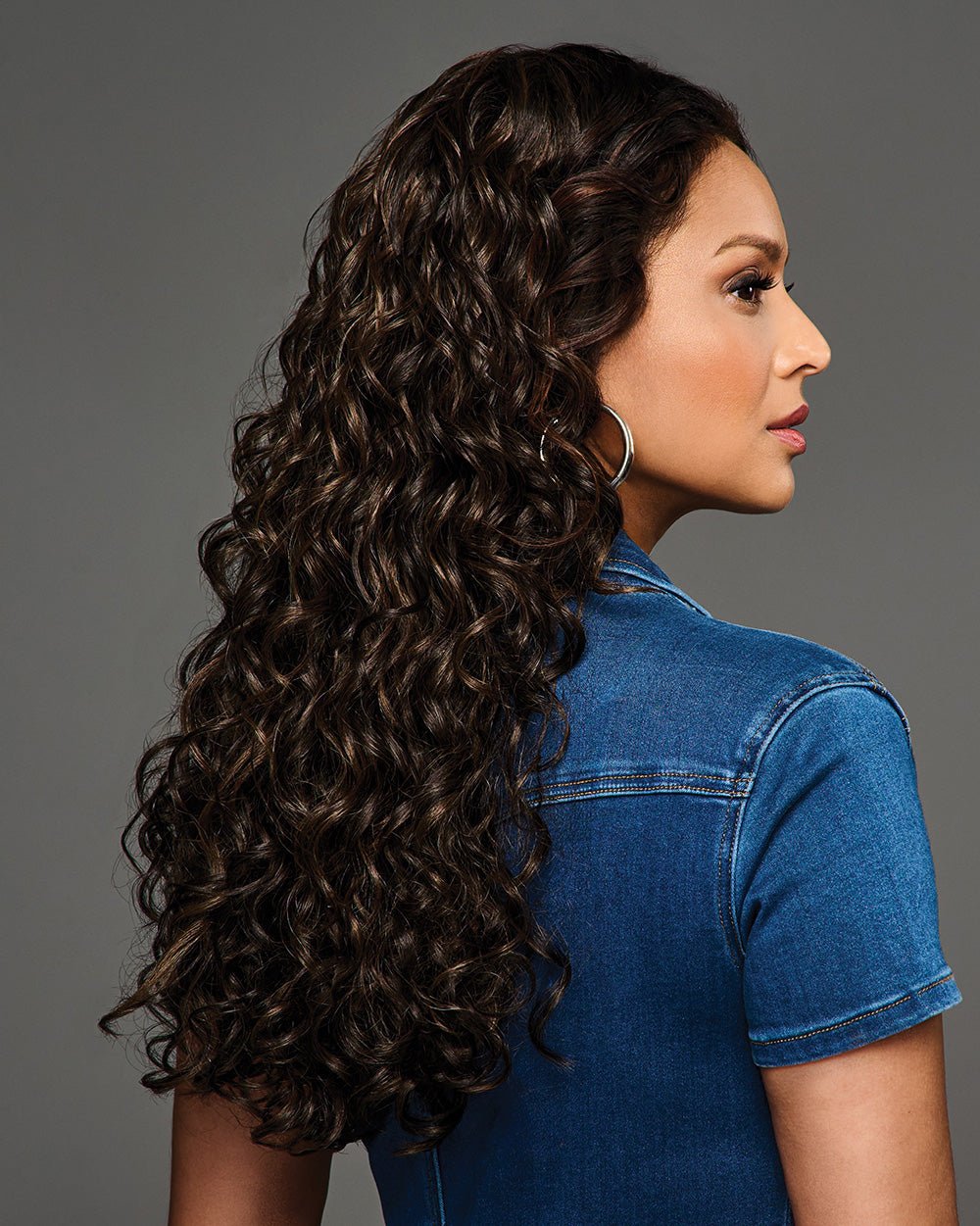 Long, layered, full-volume curls that bring the drama. This ¾ wig is like an instant weave. Skip the salon and get perfect, cascading curls without the wait! Wear as it comes with smooth, defined curls, or finger-comb for some big glam energy. Perfect for half up/half down styles.