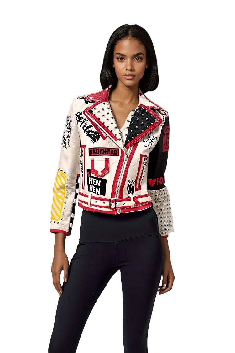 This moto inspired faux leather jacket features a bold, printed design in your choice of black/red or white/red colorways for an edgy, urban-inspired look.