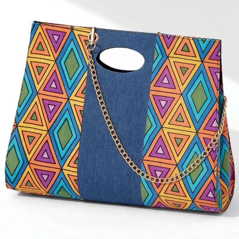 A fabulous combo of authentic print and denim makes this handbag your perfect go-to. Features a removable chain strap. 14 1/2" x 12 1/4". Fabric and manmade materials. Imported.